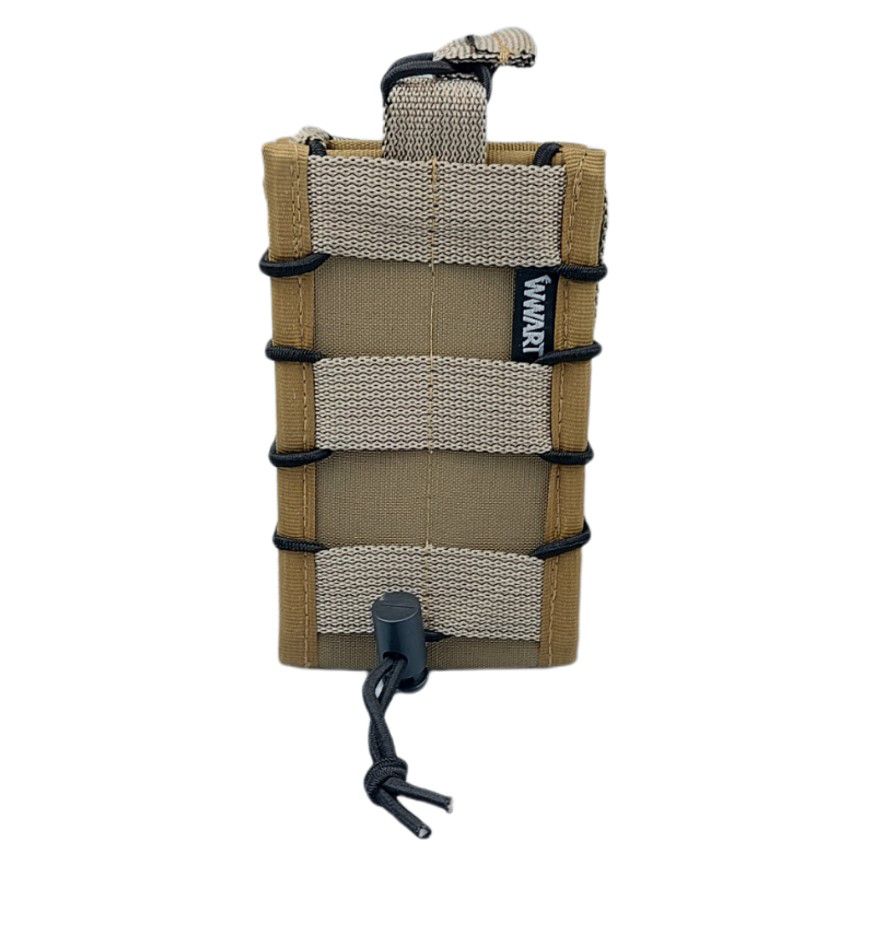 Porta carregador de fuzil modular, construído em poliéster D600 + PVC, possui fitas MOLLE na parte traseira com o novo sistema sistema de fixação por paleta que dispensa o botão de latão e torna o equipamento muito mais durável e sem a possibilidade enferrujar, mesmo em uso sob a chuva!