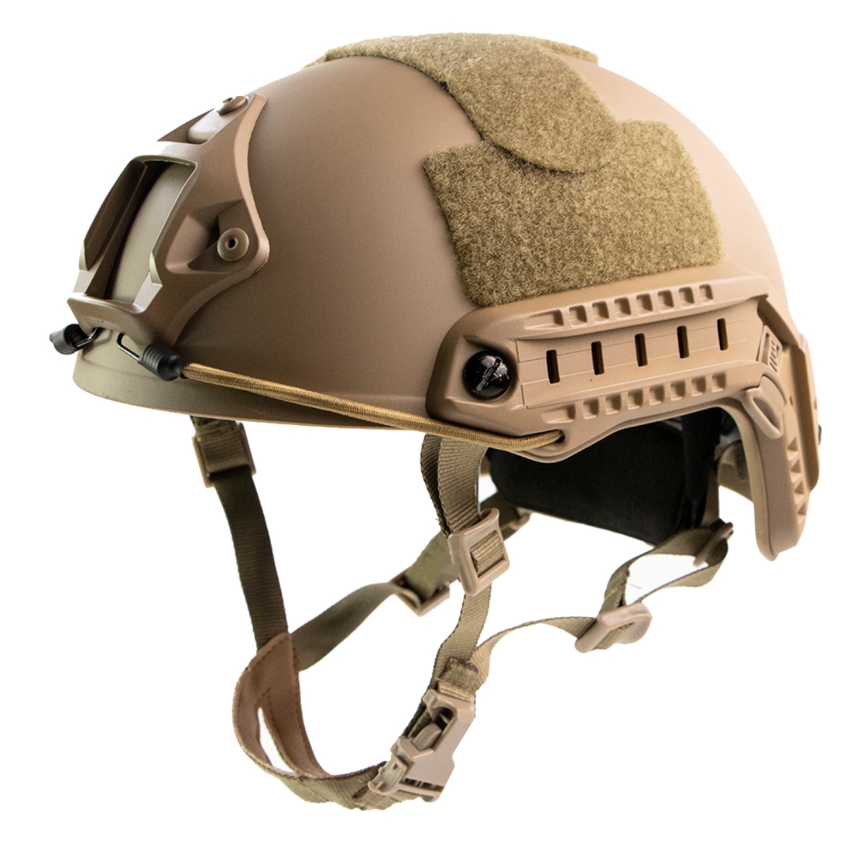 Ele vem equipado com trilhos laterais padrão ARC, perfeitos para acoplar lanternas, fones, câmeras ou outros acessórios táticos. A parte frontal conta com suporte para visão noturna (NVG) ou GoPro, facilitando a atuação noturna ou o registro de missões. Os pontos de velcro tático permitem fixar patches, contrapesos ou marcadores com praticidade e segurança.
