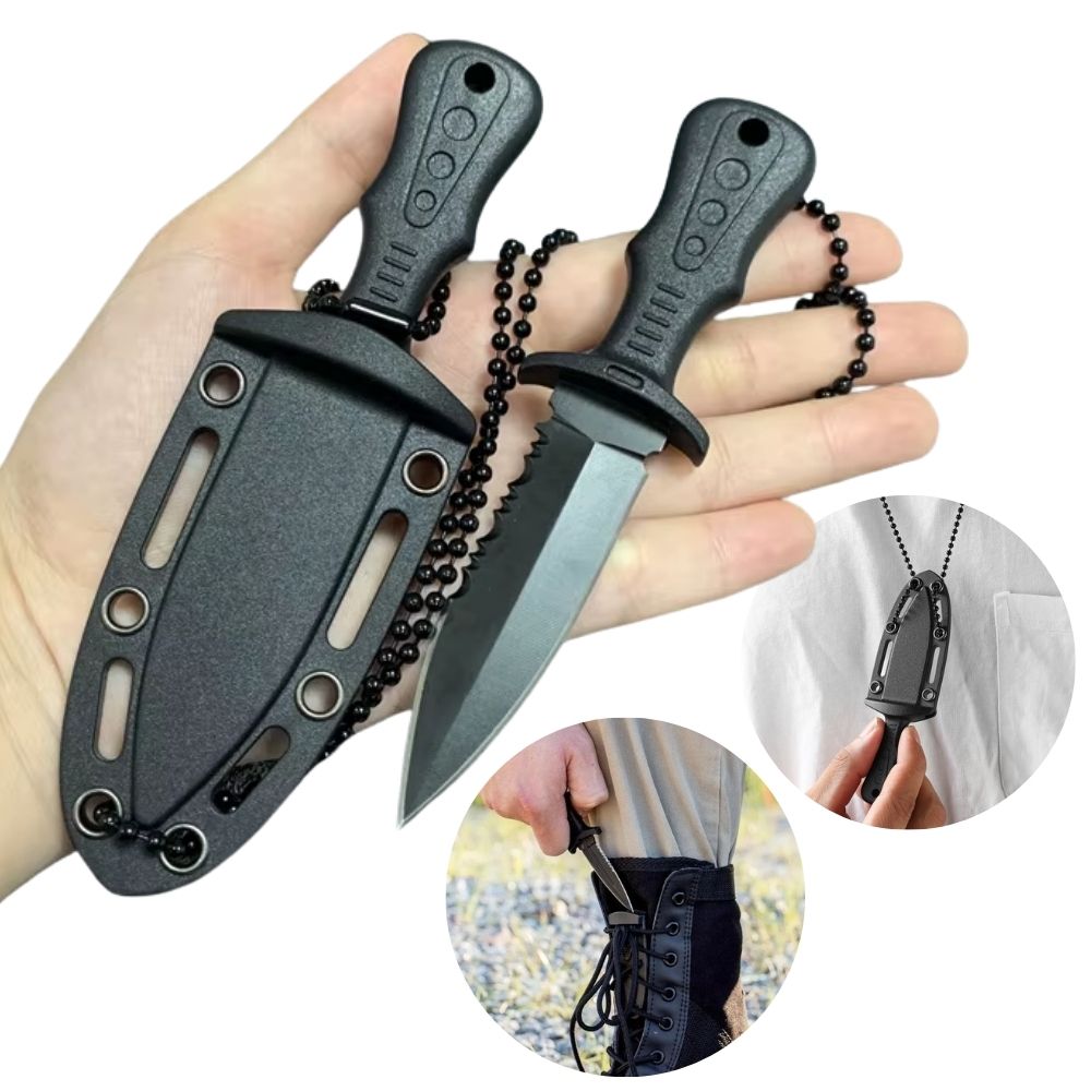 Possui Lâmina do tipo "adaga" de aço Inoxidável preta, pontiaguda e afiada, possui cordão de pescoço removível, além de uma prática bainha de polímero com orifícios para prender onde você desejar.