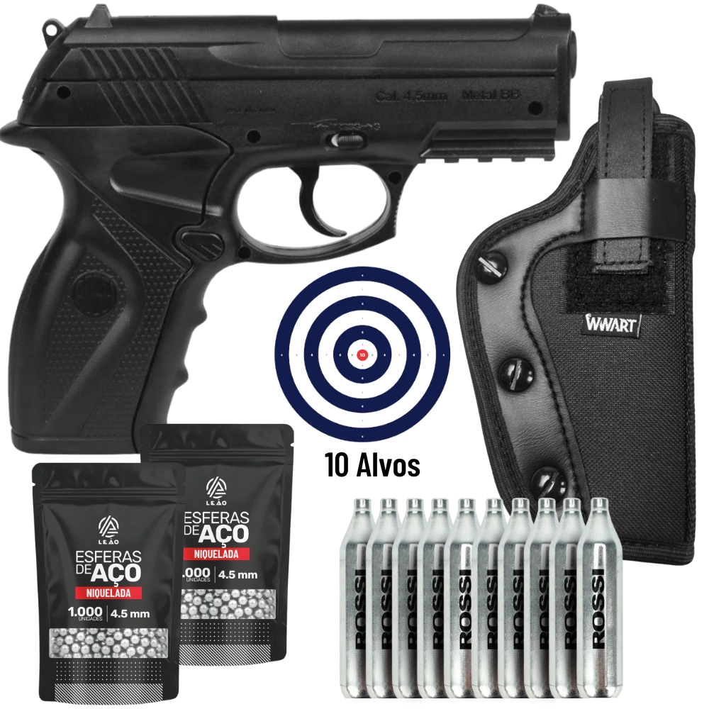 Apresentamos a Clássica Pistola de Pressão Esferas de Aço Wingun C11 Co2 4.5mm + COMBO FULL, a pistola de pressão Co2 com a melhor relação custo / benefício do mercado, ela possui seus internos principais em metal e corpo de polímero de alta densidade, resultando em um equipamento potente, que atinge facilmente os 420 FPS, confiável e de alta durabilidade.